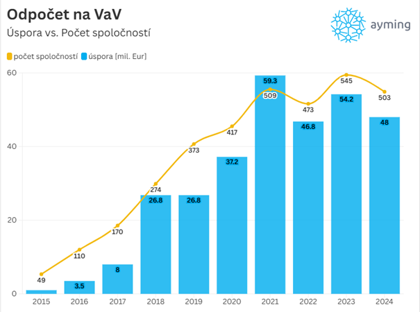 Odpočet na výskum a vývoj zostáva kritickým pilierom podpory inovácií na Slovensku. Až 40% všetkých súkromných výdavkov do výskumu, vývoja a inovácií, je podporených práve cez odpočet na VaV.