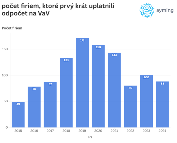 Kľúčová legislatívna zmena, ktorá znížila podporu z 200 % na 100 % oprávnených výdavkov, mala citeľný dopad na atraktivitu nástroja pre nové firmy. V roku 2024 využilo odpočet po prvýkrát len 88 nových spoločností, čo predstavuje dramatický pokles. Kým v roku 2020 bol dopad nových subjektov na celkový objem úspor trojnásobný v porovnaní s rokom 2024, dnes je situácia diametrálne odlišná.