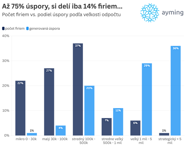 Asi nikoho neprekvapí, že naďalej dominujú veľké firmy, aj keď aj ich počet klesá. V roku 2024 si iba 84 spoločností uplatnilo odpočet vyšší ako 500 000 eur. Táto malá skupina si však rozdelila 3/4 celkového objemu úspor, čo predstavuje približne 36 miliónov eur.
