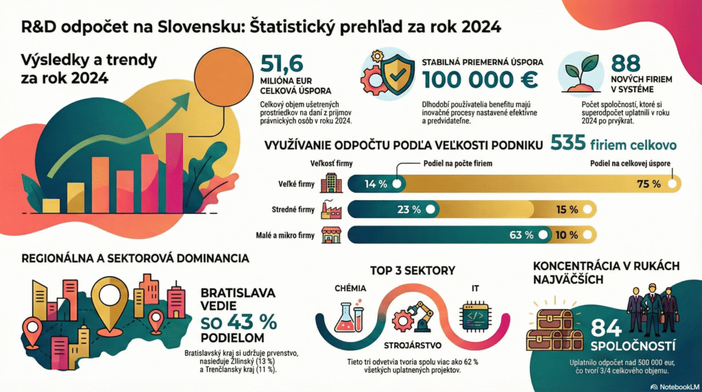 Firmy, ktoré využívajú tento nástroj dlhodobo, majú dobre zavedené a optimalizované inovačné procesy a vedia, ako benefit efektívne a konzistentne maximalizovať. Pre týchto skúsených používateľov je R&D odpočet funkčným a hodnotným nástrojom. Na druhej strane, ako ukazujú dáta o nováčikoch, systém sa stal menej prístupným a atraktívnym pre nové, potenciálne menšie inovatívne firmy, ktoré by podporu potrebovali najviac.